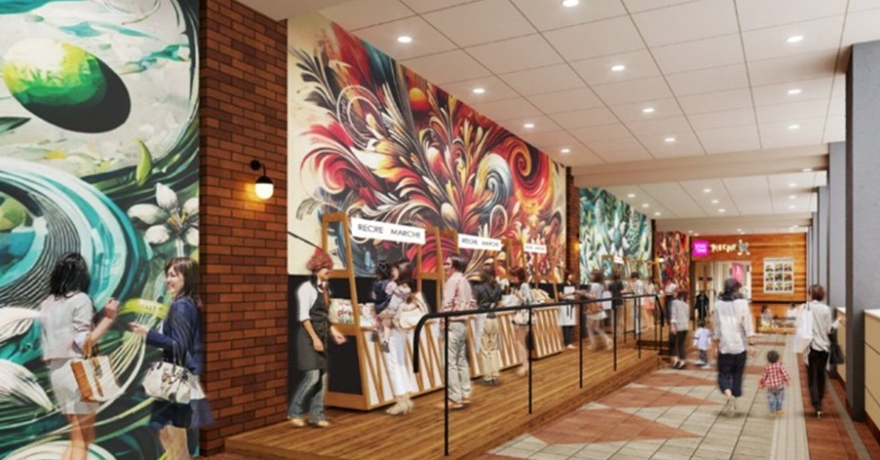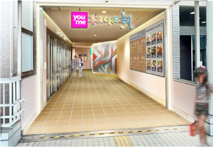 呉駅~ゆめタウン~大和ミュージアムをつなぐ自由通路とレクレ館をつなぐ通路に、ミューラルアートを施したコミュニティスペースを設置いたします。通常時は休憩スペースとして、イベント開催時は販売やイベントスペースとして利用し、迫力のあるミューラルアートと共に駅前エリアの賑わい創出に貢献します。