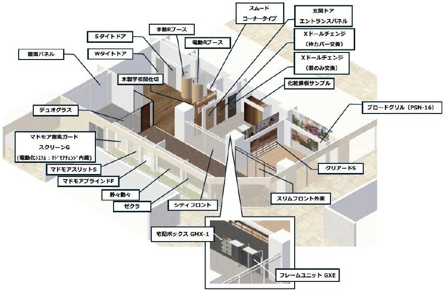 今回の新設に伴い、2024年8月にグッドデザイン賞を受賞したガラスパーティション「デュオグラス」をはじめ、トイレブース「RブースTR40電動タイプ」などの新しい商品やマンションドア、窓シャッターといったさまざまな商品を展示しています。