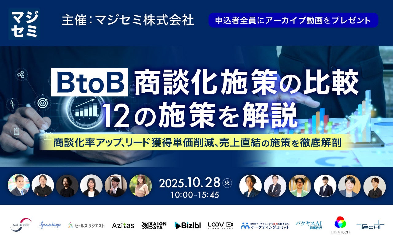 TechSuite株式会社(テックスイート/代表取締役: 畠山夏輝)は、2025年10月28日(火)にマジセミ株式会社が主催するオンラインカンファレンス「BtoB 商談化施策の比較/12の施策を解説〜商談化率アップ、リード獲得単価削減、売上直結の施策を徹底解剖〜」に登壇します。