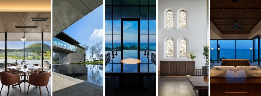 五島のシンボル「鬼岳」の噴火により形成されたとされる溶岩海岸を見下ろす高台に位置しています。内装設計とデザインを手がけた橋本夕紀夫氏がテーマに掲げたのは「The view」。どこまでも続く美しい海景、身体を包み込む海風。鐙瀬ならではのダイナミックで雄大な自然が主役となるようなデザインが、館内にちりばめられています。