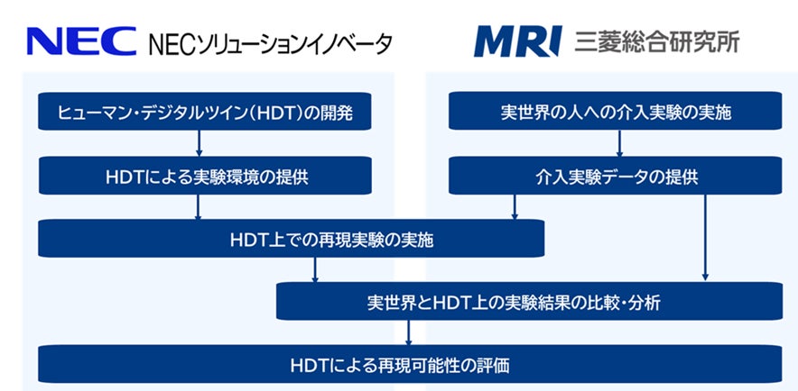 MRIおよびNECソリューションイノベータは、本研究活動を通じて、日本人の心理・行動特徴を学習したHDTが、実際の人の介入への反応をどの程度再現できるかを評価し、HDTでの再現可能性と今後の展望を明らかにします。