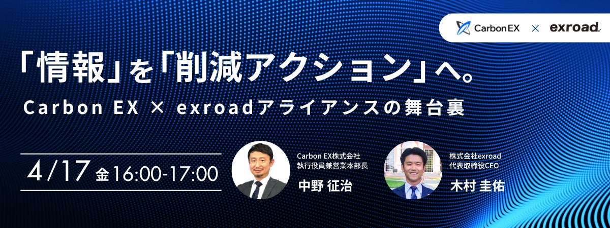 今回、Carbon EX株式会社と初の共催ウェビナーとなります。先月3月17日に発表した通り、当社(exroad)はM&Aによりアスエネグループに参画しました。アスエネグループ内のカーボンクレジット専門企業であるCarbon EXとのシナジーを通じて、一層有益な情報発信に努めてまいります。