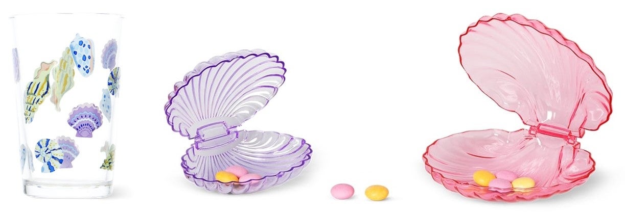貝殻のグラスに麦茶を入れて、キュートなプレートにお菓子を置いて。夏ののんびりおやつ時間のセットが完成です。小物入れとしても使えますよ!