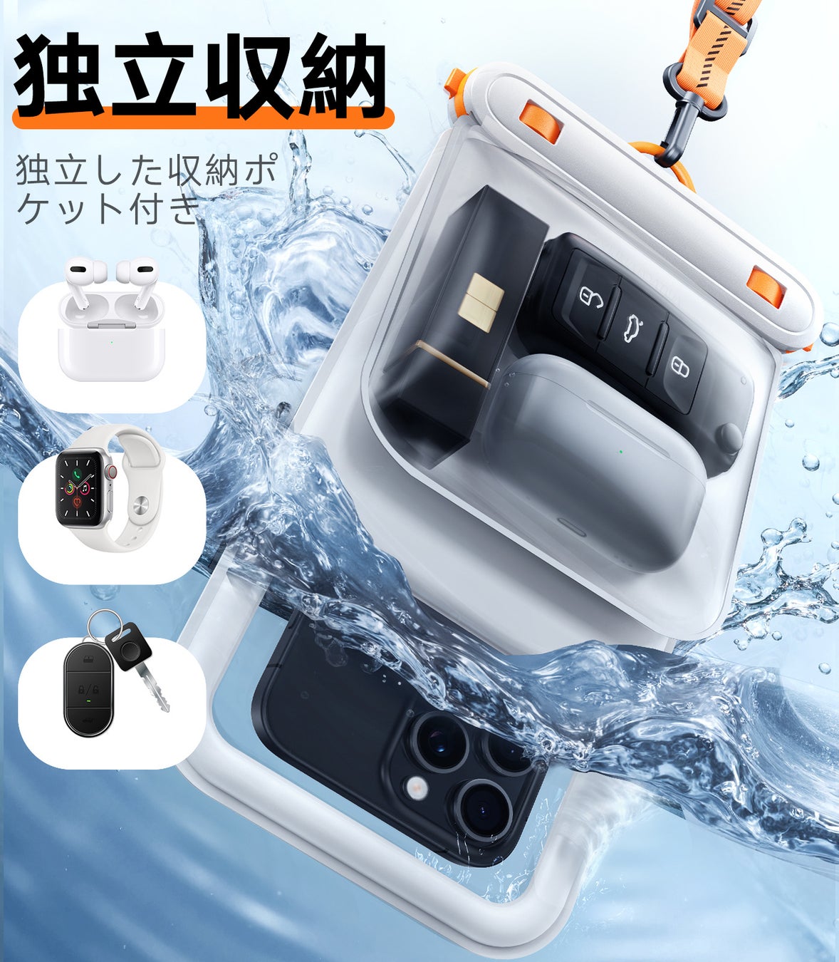 FlowPocketsは、「スマホと小物を同時に入れたい、でもスマホは傷付けたくない」というユーザーの声に応えた、2つの独立した収納ポケットを備えた新作防水ケースです。深い水中での水圧にも耐えられる完全防水で、海でのレジャーやマリンスポーツにぴったりです。