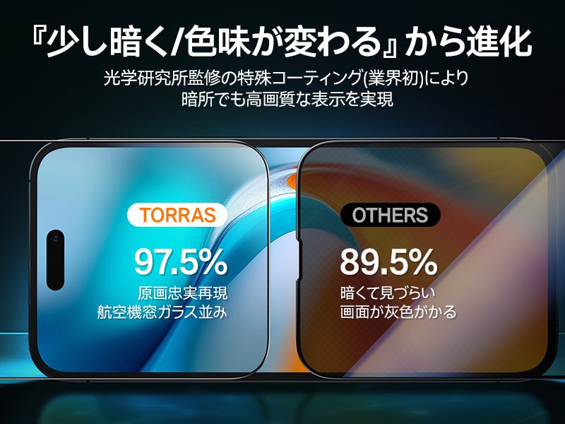 TORRASスマホ保護フィルム「Glass Go」シリーズに、プライバシー保護機能を備えた覗き見防止タイプが新登場。視野角はわずか25°と狭く、横からの視線をしっかり遮断。さらにブルーライトカット機能も搭載し、プライバシーと目の健康を同時に守ります。