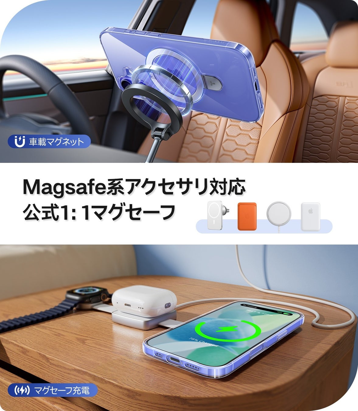 TORRAS 「Ostandシリーズ」はO型の多機能リングを搭載。指にかけるリングとしても、スマホを置いて使うスタンドにもなります。MagSafeにも対応しており、強力な磁気でワイヤレス充電や、揺れの激しい車の中でも安心して使えます。