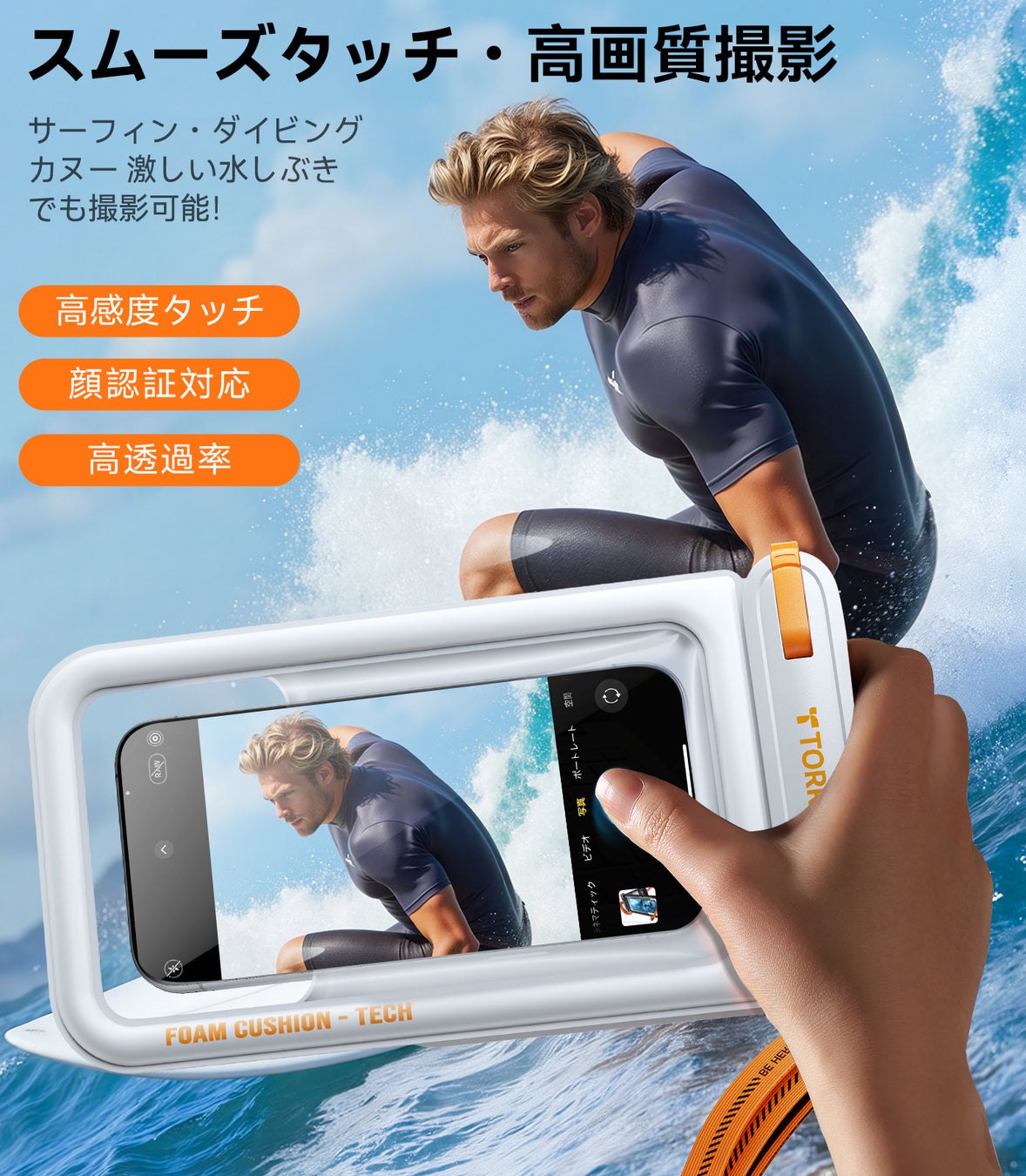 透明度の高いTPU素材を採用し、ケースに入れたままでも、スムーズなスマホ操作や通話、撮影が可能です。顔認証にも対応しており、濡れた指でロック解除ができないストレスから解放されます。水中での撮影もスムーズで、いつでもどこでも特別な瞬間をスマホにおさめることができます。
