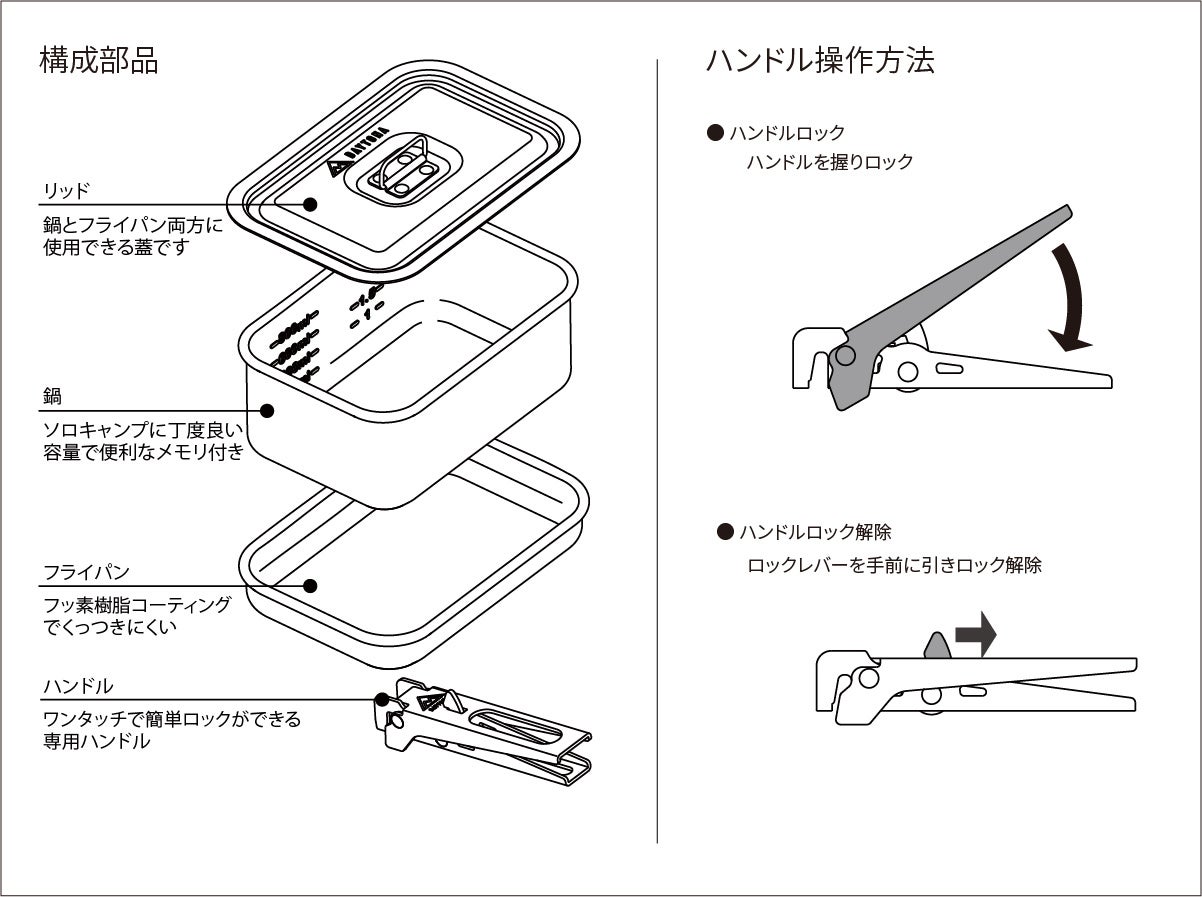 ワンタッチロック機構付きハンドル、焦げ付き防止加工を施したフライパン、そしてハードアルマイト加工を施した鍋とリッドがセットになったソロキャンプに最適な基本調理セットです。使うときはカチッと装着、収納時はスッと外せるワンタッチロック機能付きハンドルが付属。ハンドルが外れることでクッカー自体がスリムになり、バッグやボックスに無理なく収まります。