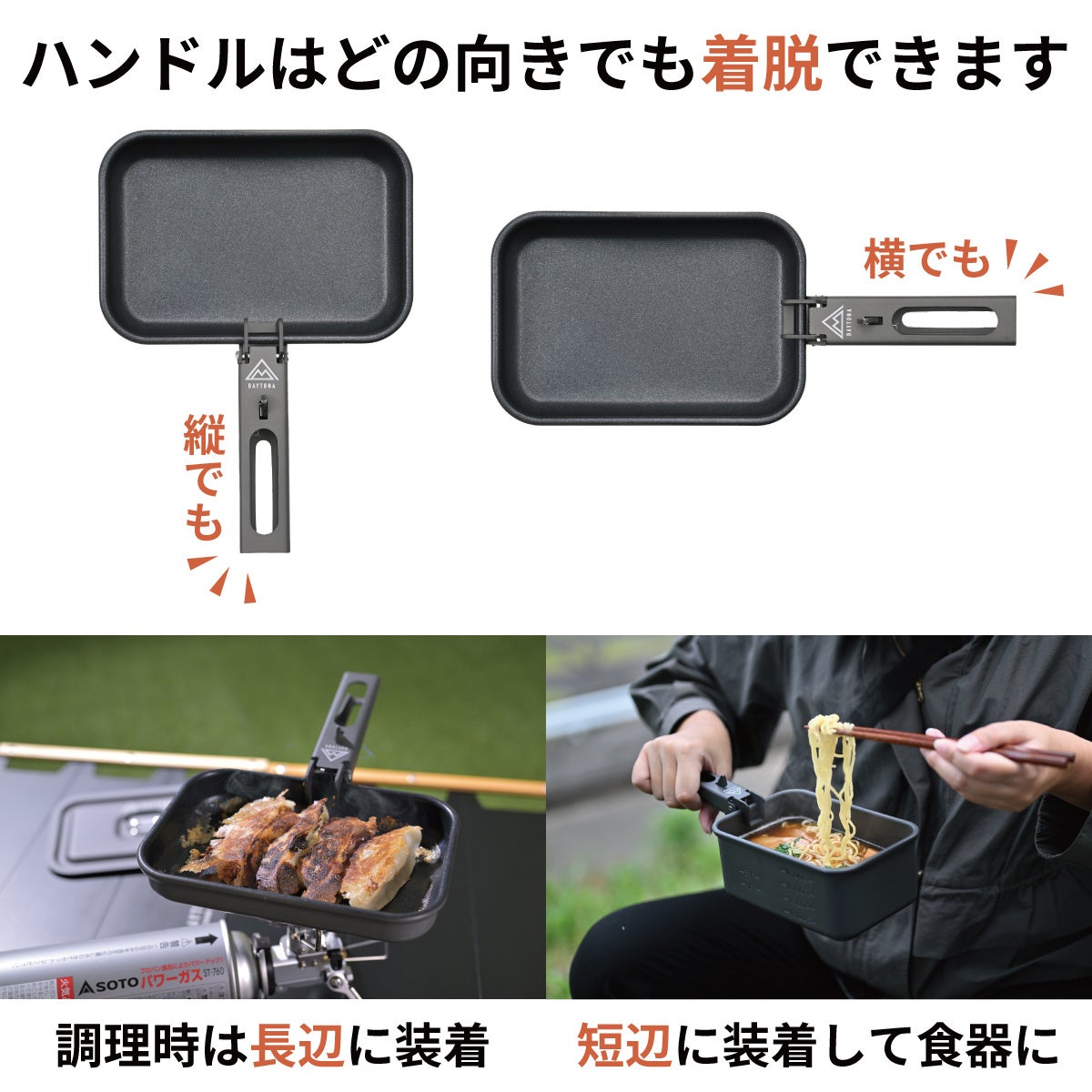 また鍋・フライパンへどの向きでも着脱できるため、ハンドル位置を変更することで色々な使い方が可能です。
