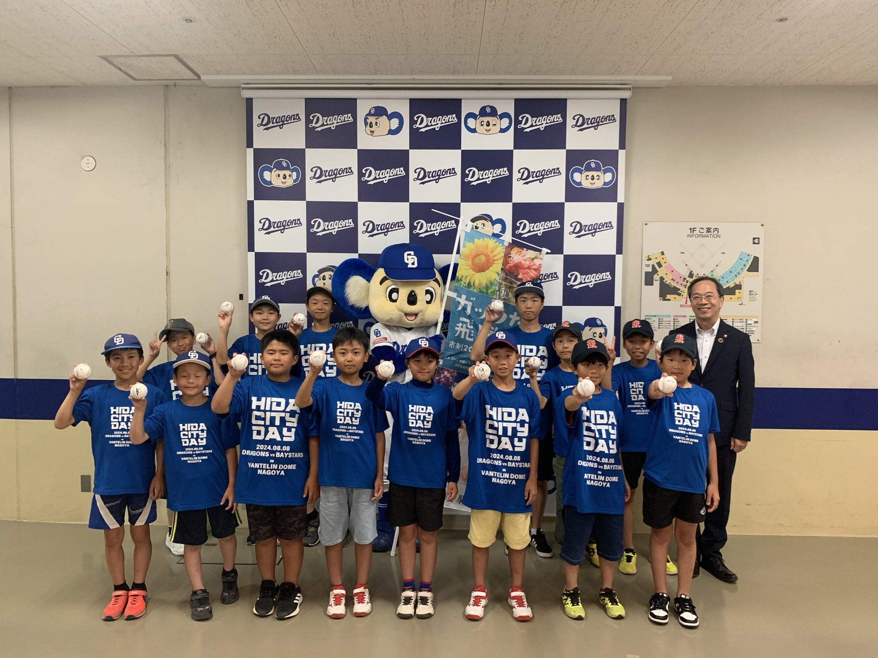 寄附メニューの1つである「飛騨の子どもたちをスポーツで元気に」に寄せられた寄附金を活用し、東海地方のプロ野球チームであり、飛騨市出身の根尾昂投手が在籍する中日ドラゴンズの公式戦においてゲームスポンサーを実施し、始球式や両チームに対し飛騨市の特産品を送る贈呈式、守備位置でスタメン選手を迎えるオンユアマークスに市内の子どもたちが参加しました。