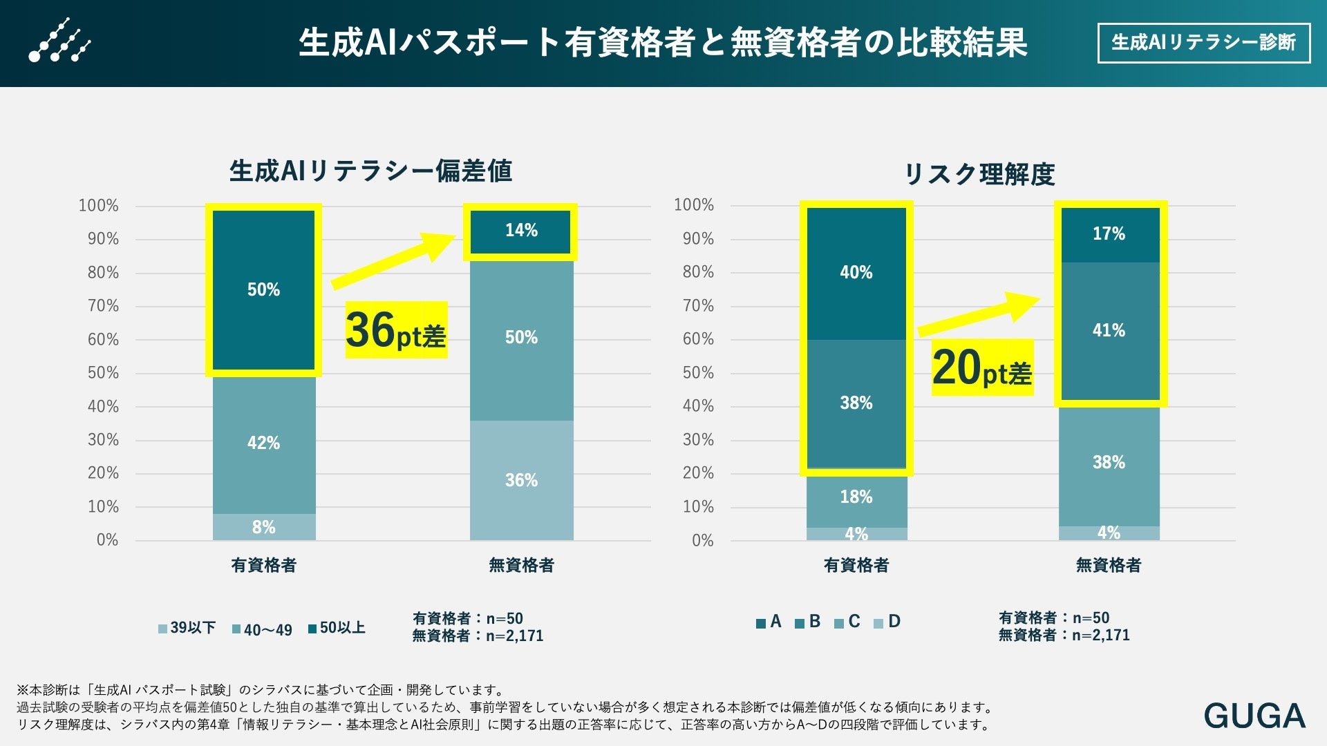 生成AIパスポートの有資格者は、生成AIリテラシー偏差値50以上の割合が50%、リスク理解度「A・B」評価が78%であったのに対し、無資格者は生成AIリテラシー偏差値50以上の割合が14%、リスク理解度「A・B」評価が58%にとどまっており、学習経験の有無による差が浮き彫りになりました。