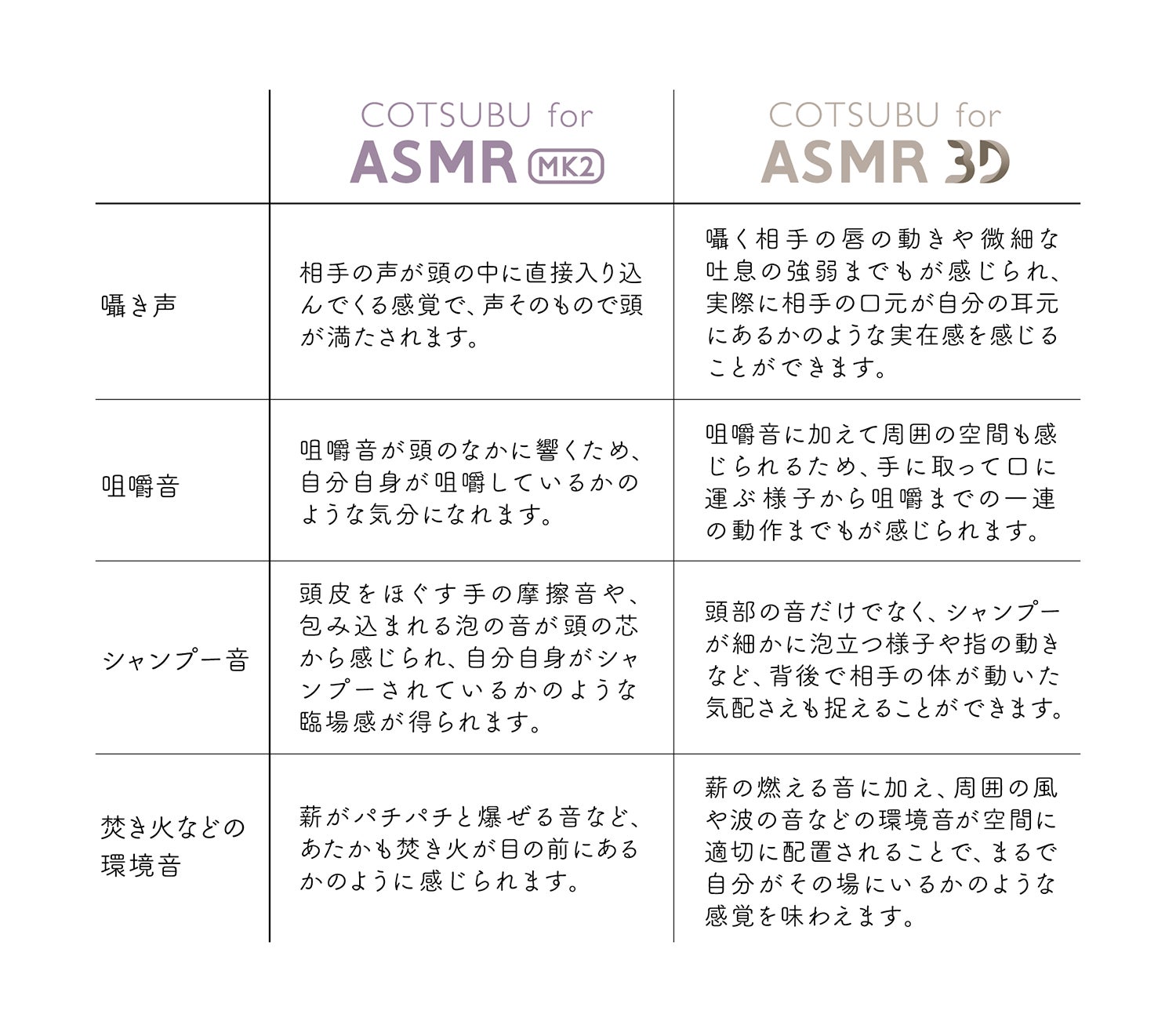 COTSUBU for ASMR 3Dは2024年3月21日(木)18:00より、COTSUBU for ASMR MK2は2024年3月29日(金)より発売を開始いたします。