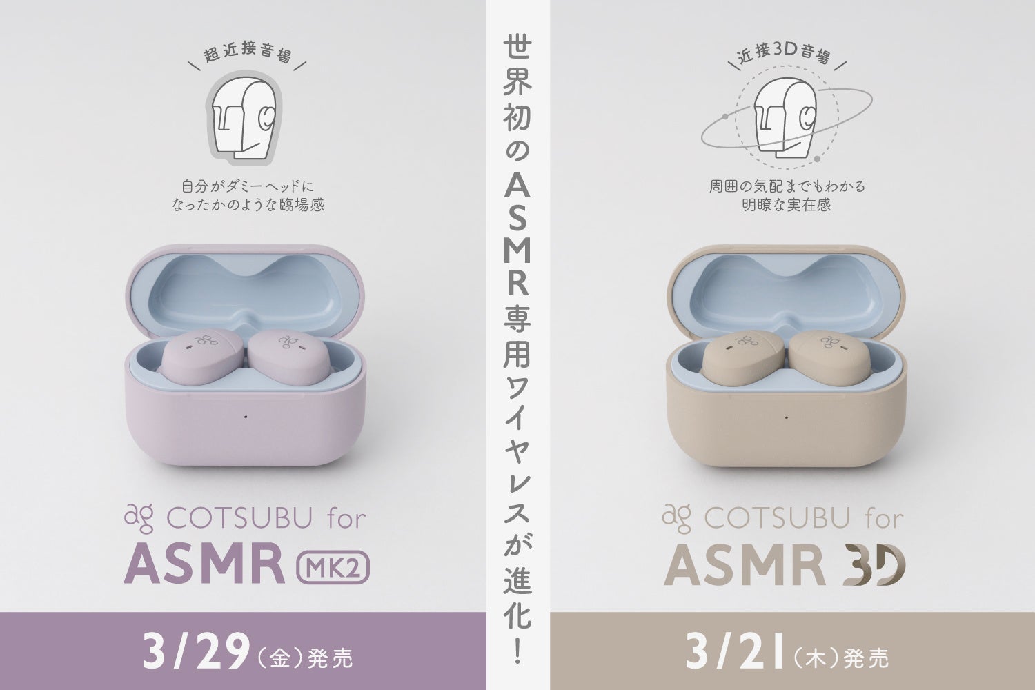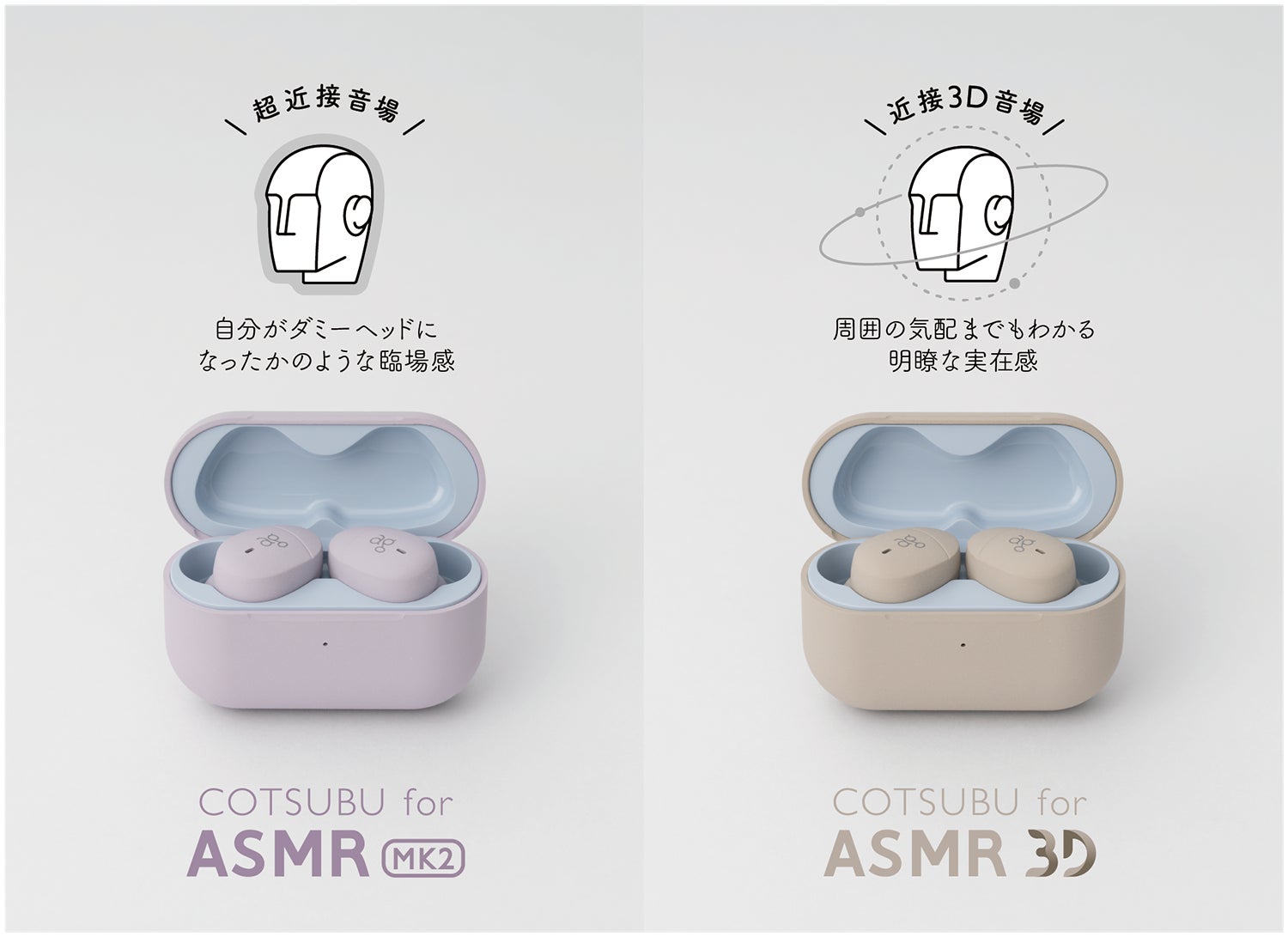世界初のASMR専用ワイヤレスイヤホンがさらに進化! 超近接音場に特化した「COTSUBU for ASMR MK2」と、近接3D音場に特化した「COTSUBU for ASMR 3D」が新登場