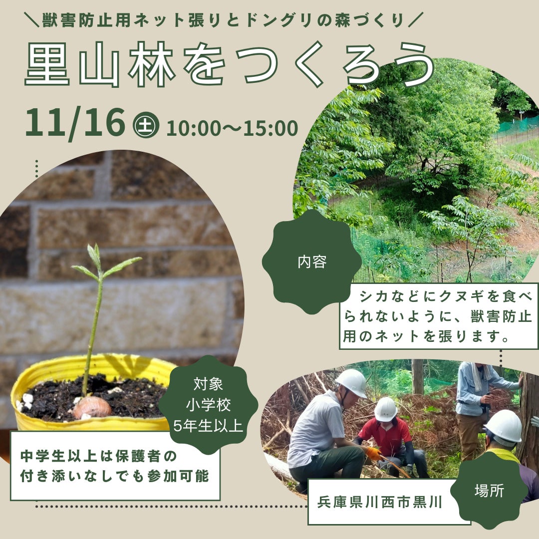 "豊かな里山づくり"を目指しているイベント「里山林をつくろう」。11月はシカの食害対策のため、獣害防止用ネット張りを行い、ドングリをポットに植えて植樹の準備をします。ご興味ある方はご参加ください。