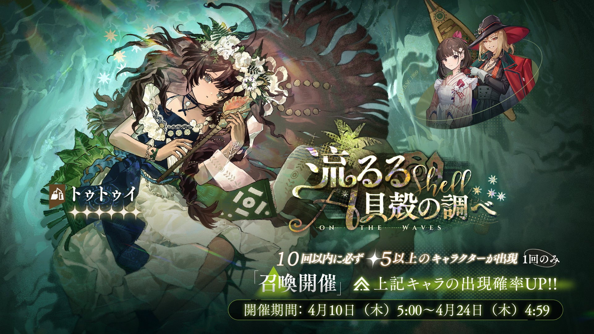 召喚イベント「流るる貝殻の調べ」では、トゥトゥイをはじめ、「テナント(CV.たかはし智秋)」「五色月(CV.東山奈央)」の出現率も大幅に上昇していますので、ぜひあわせてお迎えください。