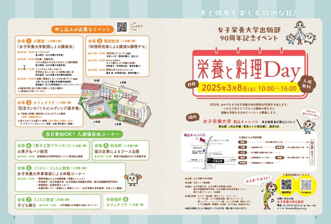 当日は、同大学教授陣による講演や、協賛企業による食と健康に関する講演やサンプリングなどが行われ、『栄養と料理』創刊号掲載料理でのランチ提供(有料500円/要事前予約)も行われる予定です。