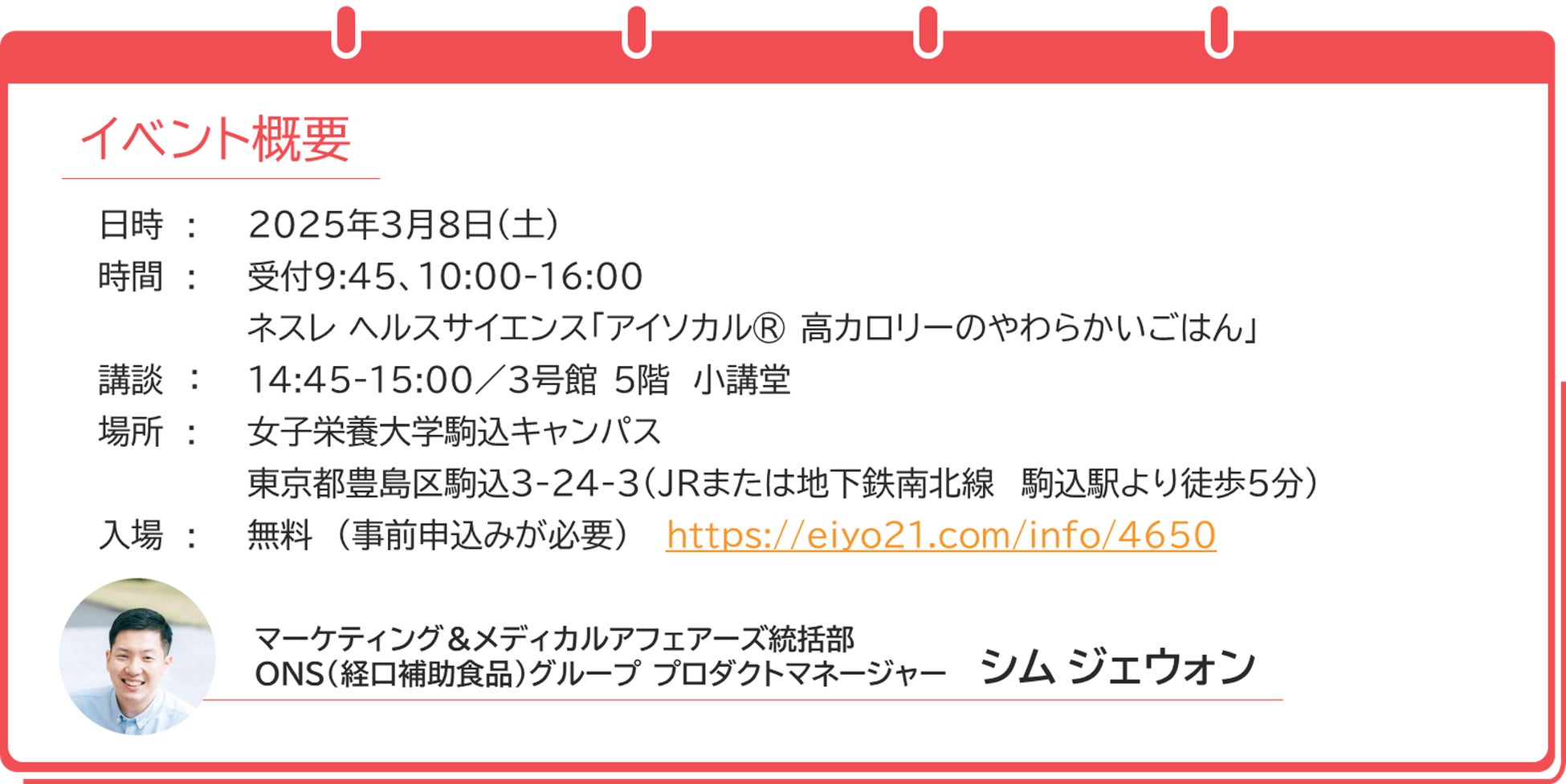 ネスレ日本株式会社 ネスレ ヘルスサイエンス カンパニー(本社:兵庫県神戸市、カンパニープレジデント:中島昭広)は、3月8日(土)に東京都駒込で開催される女子栄養大学出版部の90周年記念イベント「栄養と料理Day」に参加し、『アイソカル® 高カロリーのやわらかいごはん』を紹介します。このイベントでは、同大学出版部が長年取り組んできた「食と健康」をテーマに、さまざまなセミナーや試食コーナーを通じて楽しく学べる場が提供されます。