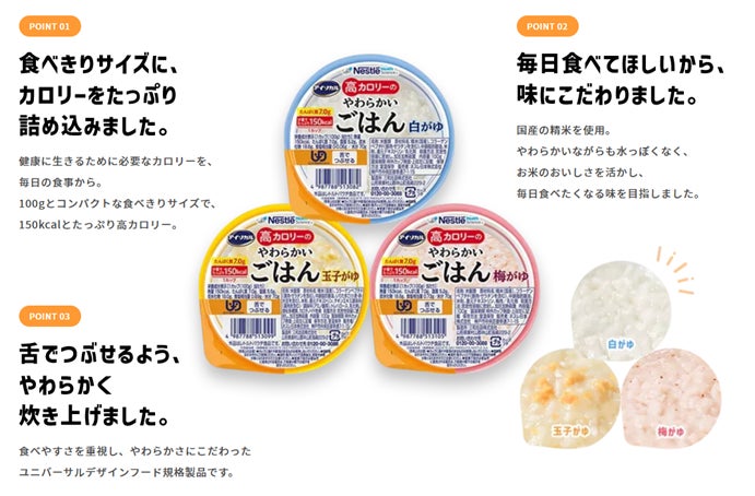 介護食は、やわらかさを重視することから量に対してカロリーが低くなりやすい傾向があります。介護食を必要とする高齢者のために新しい介護食の提案として開発されたのが、「アイソカル® 高カロリーのやわらかいごはん」。1カップ(100g)あたり150kcalの高カロリー。完食しやすいようにコンパクトなサイズにカロリーを詰め込んだカップ入り介護食です。