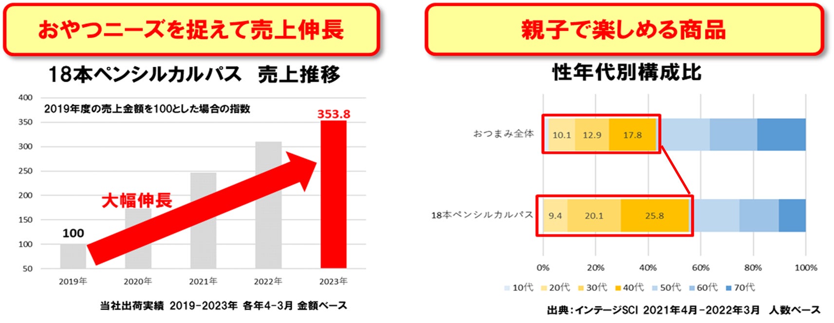 「18本ペンシルカルパス」は2016年に発売以来、幅広いお客様にご好評いただいています。大人のおつまみとしてだけでなく、「子どもを含む家族みんなのおやつ」として使われていることが好調の要因だと考えています。しかし、おつまみはお酒のお供としてのイメージがまだまだ強いのも事実です。そこで、大人だけでなく、子どものおやつとしてもっと楽しんでいただくきっかけを創出したく、2021年より人気キャラクターの「すみっコぐらし™」とのコラボレーションを行ってきました。