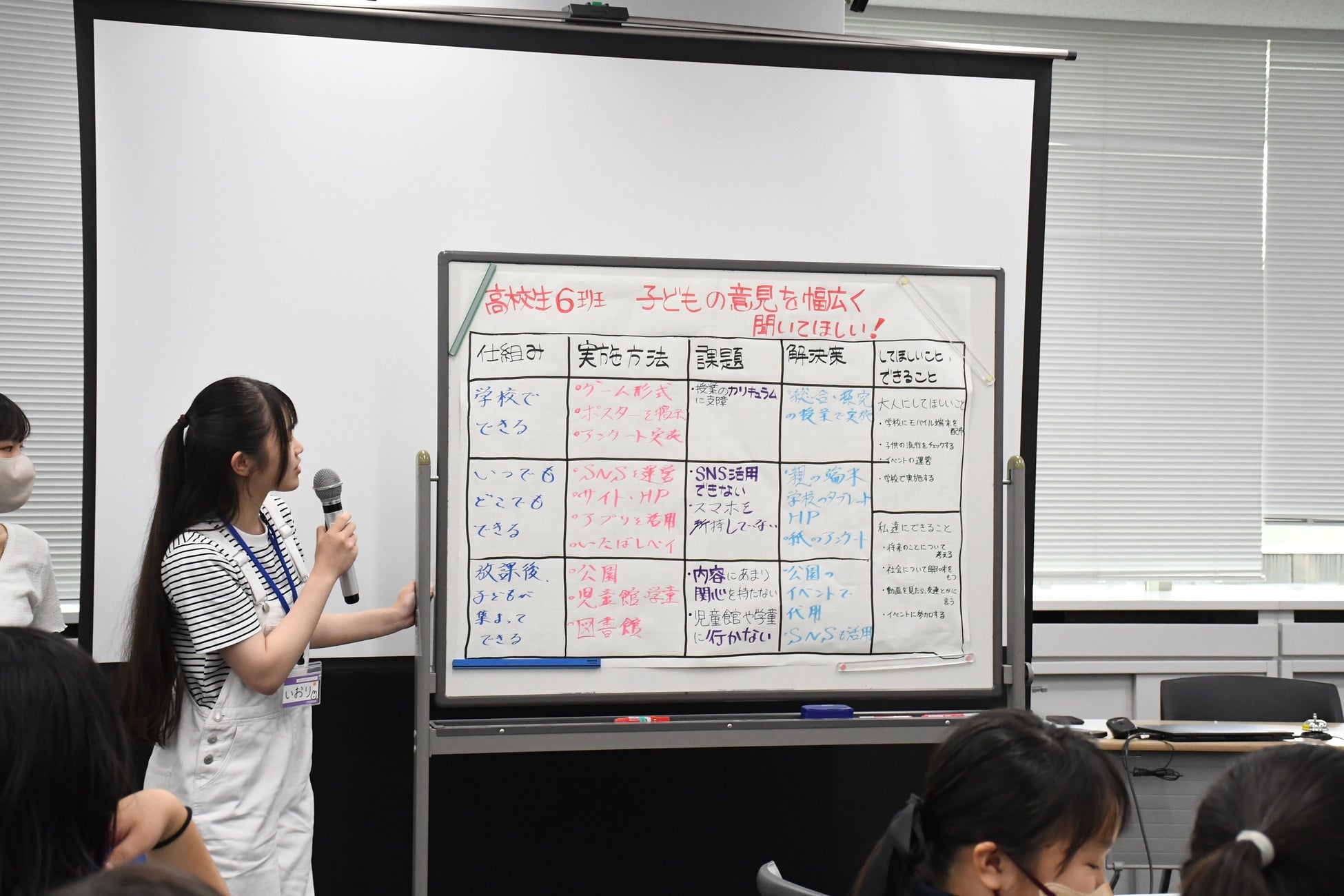 高校生の班は「子どもの意見を幅広く聞ける仕組みをつくりたい!」と、少しレベルアップしたテーマに対し、まずは「学校でできること」「いつでもどこでもできること」「放課後子どもが集まってできること」とシチュエーション別に考えました。実施方法については、「ゲーム形式で意見を聴く」「SNSやアプリを活用する」など、より意見を聞ける方法を自身の視点で考えるとともに、それぞれの課題や解決策、大人にしてほしいこと・自分たちができることを併せて考え、提案しました。