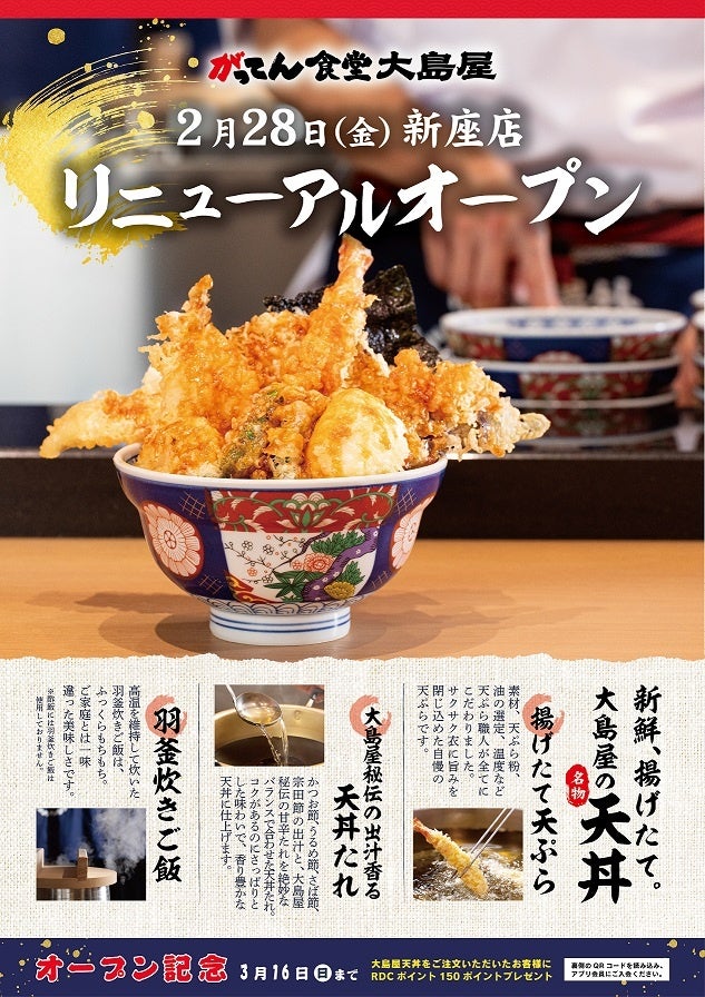 オープン記念!! 3月16日(日)までに来店いただき大島屋天丼をご注文いただいたお客様には RDCポイントを『150ポイント』プレゼントいたします!