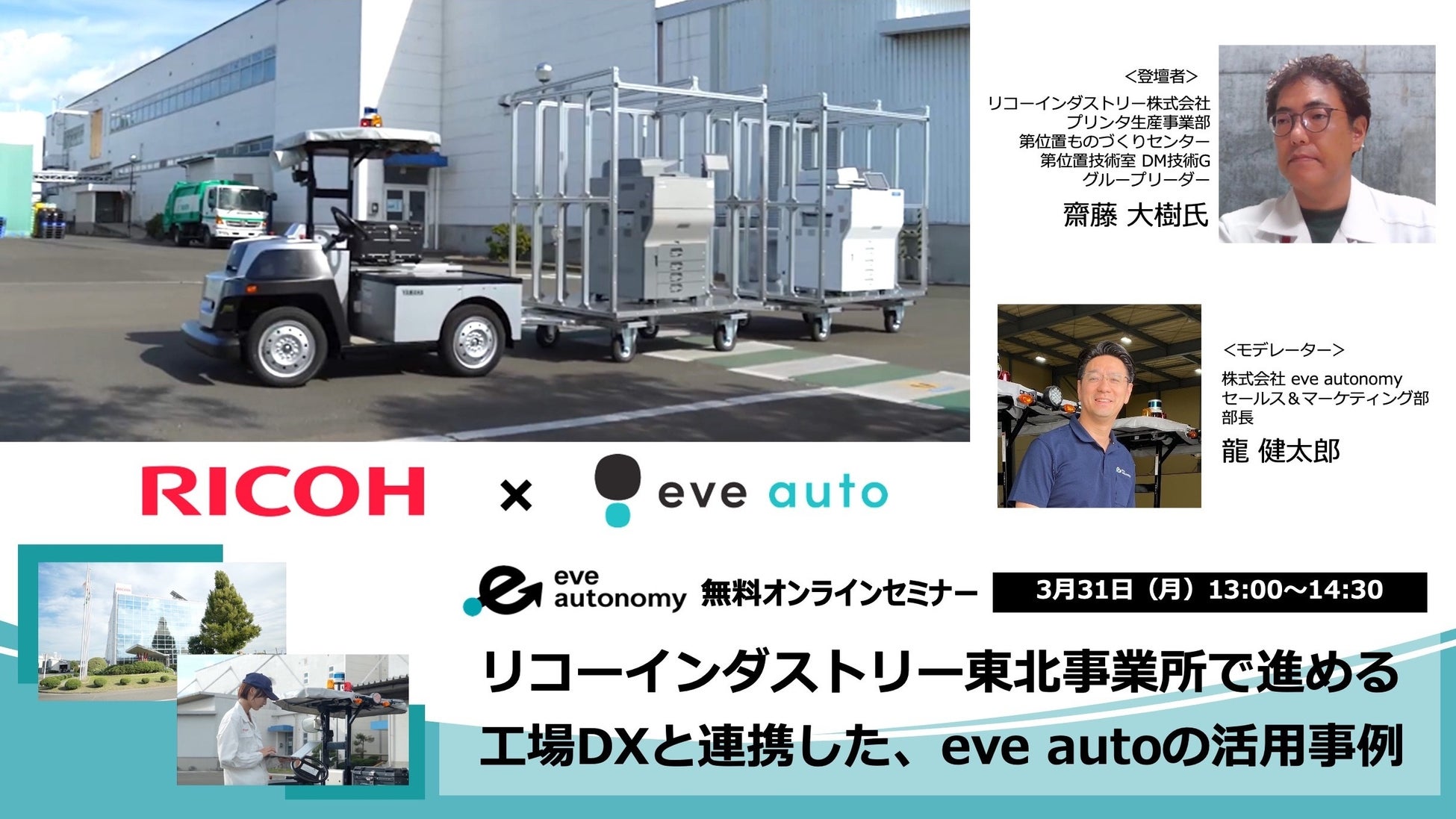 株式会社eve autonomy(イヴ・オートノミー、静岡県磐田市、代表取締役CEO:星野 亮介、以下「eve autonomy」)は、2025年3月31日(月)に、自主開催となる無料オンラインセミナー「リコーインダストリー東北事業所で進める工場DXと連携した、eve autoの活用事例」を開催いたします。本セミナーでは、eve autonomyの屋外自動搬送ソリューション「eve auto」を導入されたリコーインダストリー株式会社 東北事業所のご担当者様をお迎えし、導入の背景や課題、運用における具体的なメリットについてディスカッションを行います。