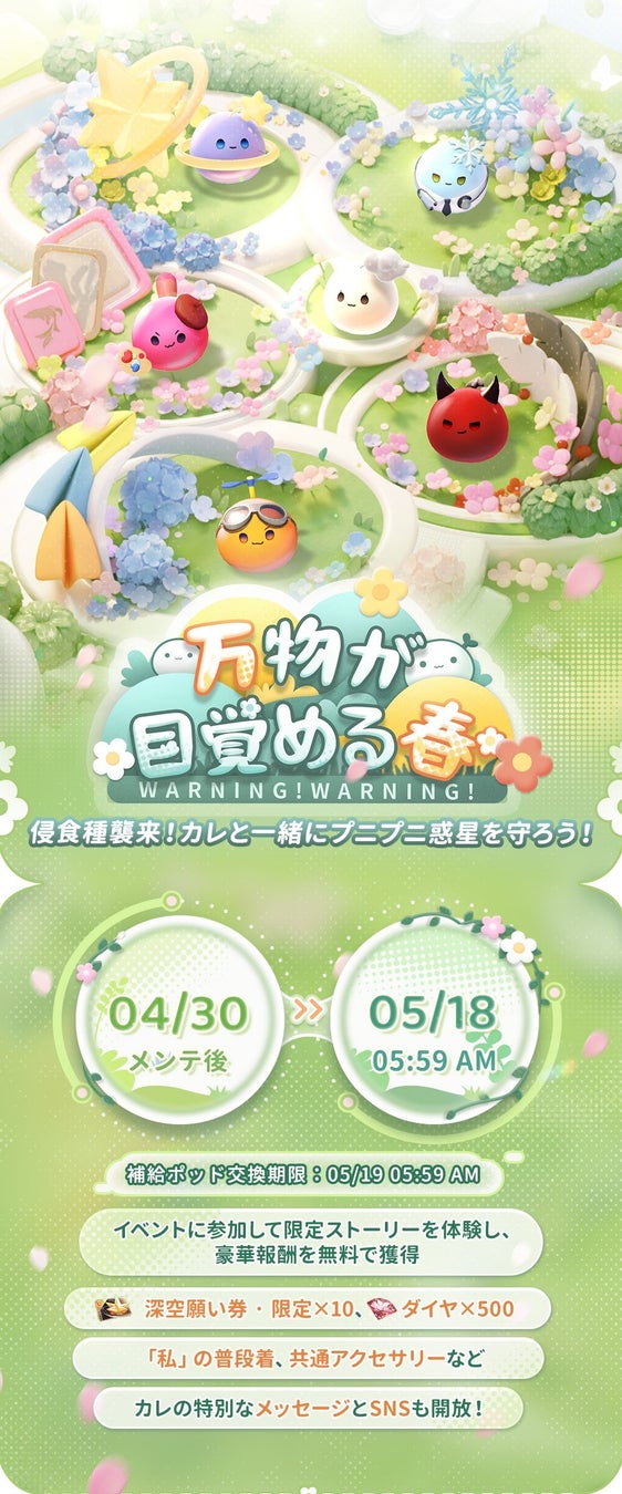 イベント説明:イベント期間中、カレと力を合わせてプニプニ惑星を守ろう!イベントに参加することで【深空願い券・限定×10】、【ダイヤ×500】、「私」の普段着【胸躍る瞬間】、共通顔飾り【雨上がりの虹】、【晴れの日の虹】、【限定称号】、【共通秘蔵品】、【限定吹き出し】を含む様々な報酬を無料で獲得できます。また、カレからの特別メッセージとSNS投稿も開放されます!