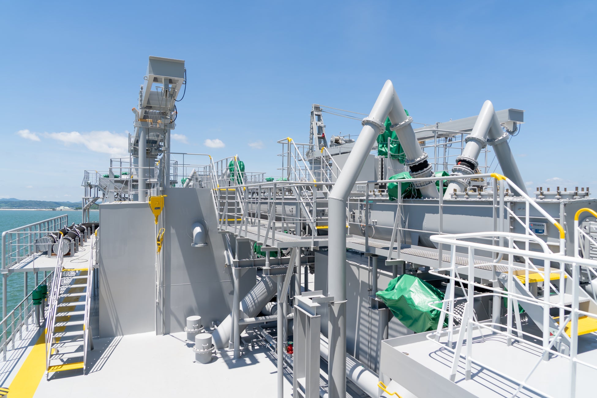 荷役設備にはスペロセイキ株式会社製の圧送装置(500t/h×2)と、スクリューコンベヤーを縦横に配置したシステムを採用。これにより多品種・高品質なセメントの安全かつ迅速な積み下ろしが可能となりました。荷役の制御運転にも重点が置かれており、品質管理と作業の安全性向上を同時に実現しています。