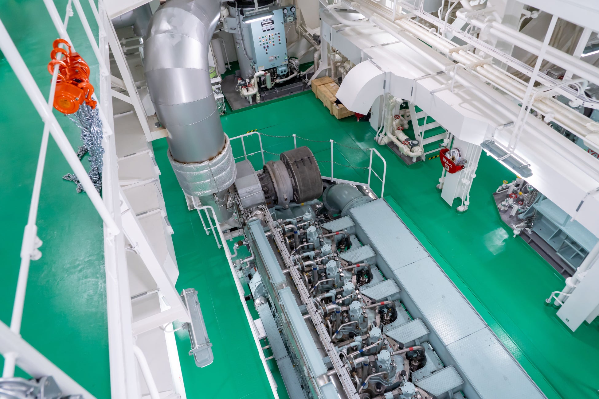 「竜王」は、阪神内燃機工業株式会社製の低速4サイクル主機「LH46LAES」を搭載。吸気弁の早閉じと電子制御燃料系統によるミラーサイクル運転を採用し、NOx(窒素酸化物)の排出低減と優れた燃費性能を両立しました。
