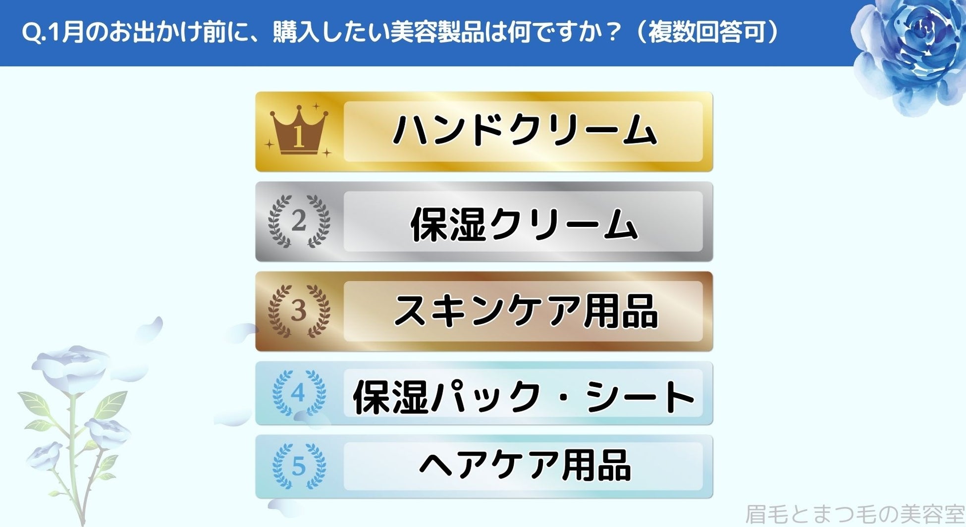 1月のお出かけ前に、購入したい美容製品をお聞きしたところ「1位>ハンドクリーム」、「2位>保湿クリーム」、「3位>スキンケア用品」、「4位>保湿パック・シート」、「5位>ヘアケア用品」という結果になりました。
