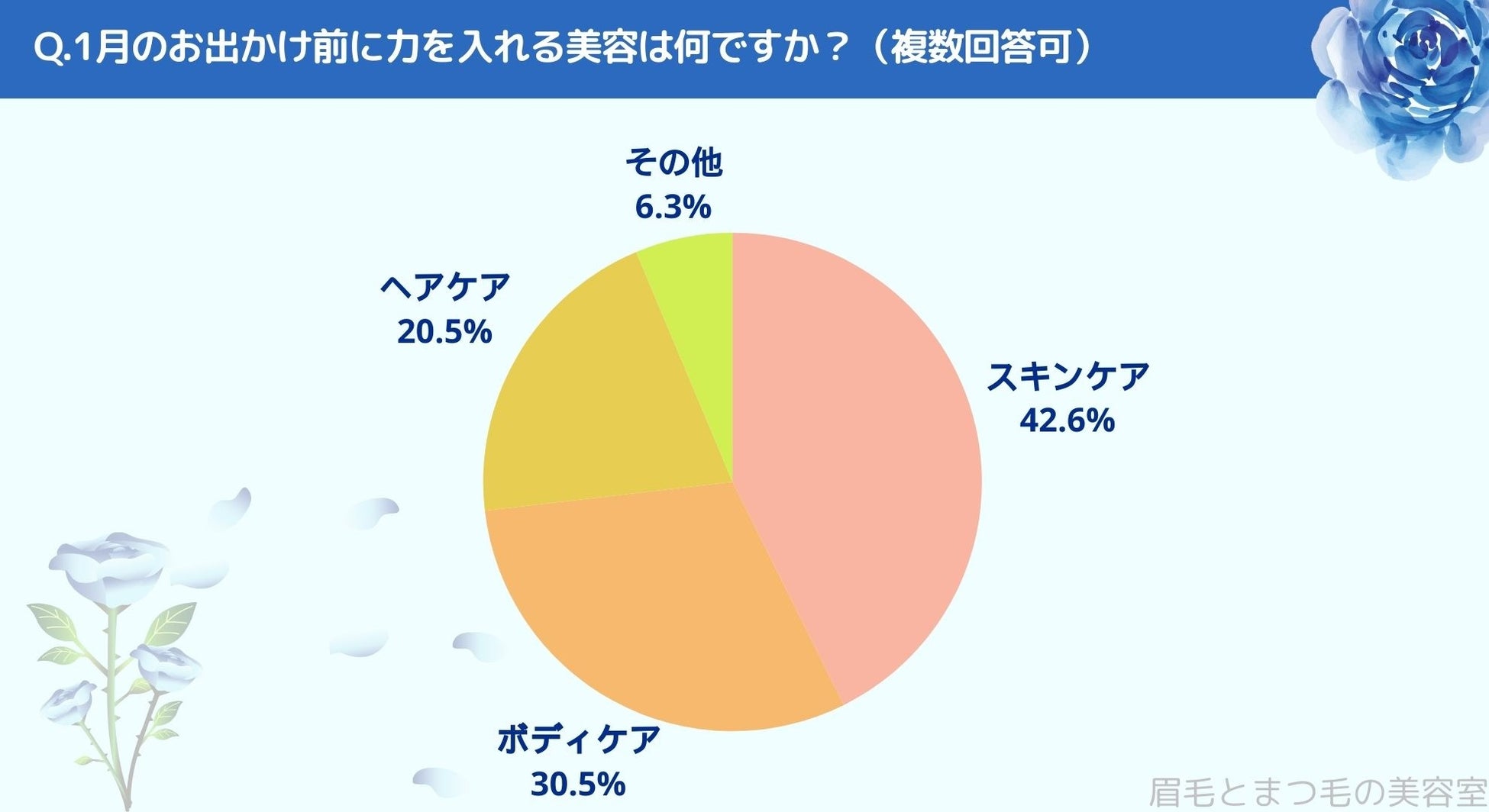 1月のお出かけ前に、どんな美容ケアに力を入れているかお聞きしたところ「スキンケア(42.6%)」、「ボディケア(30.5%)」、「ヘアケア(20.5%)」、「その他(6.3%)」という結果になりました。
