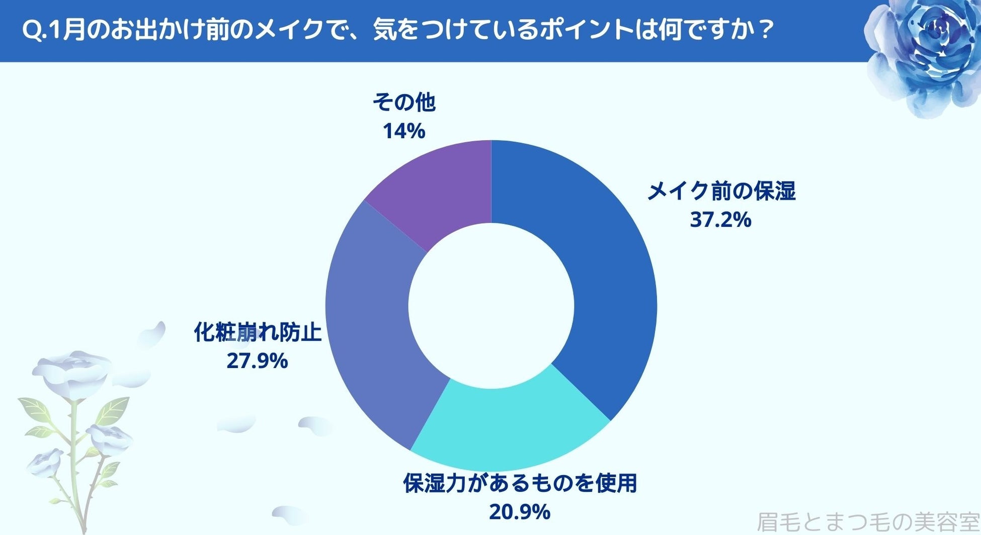 1月のお出かけ前のメイクで、気をつけているポイントをお聞きしたところ「メイク前の保湿(37.2%)」、「保湿力があるもの(メイク道具)を使用(20.9%)」、「化粧崩れを防止(27.9%)」、「その他(14%)」という結果になりました。