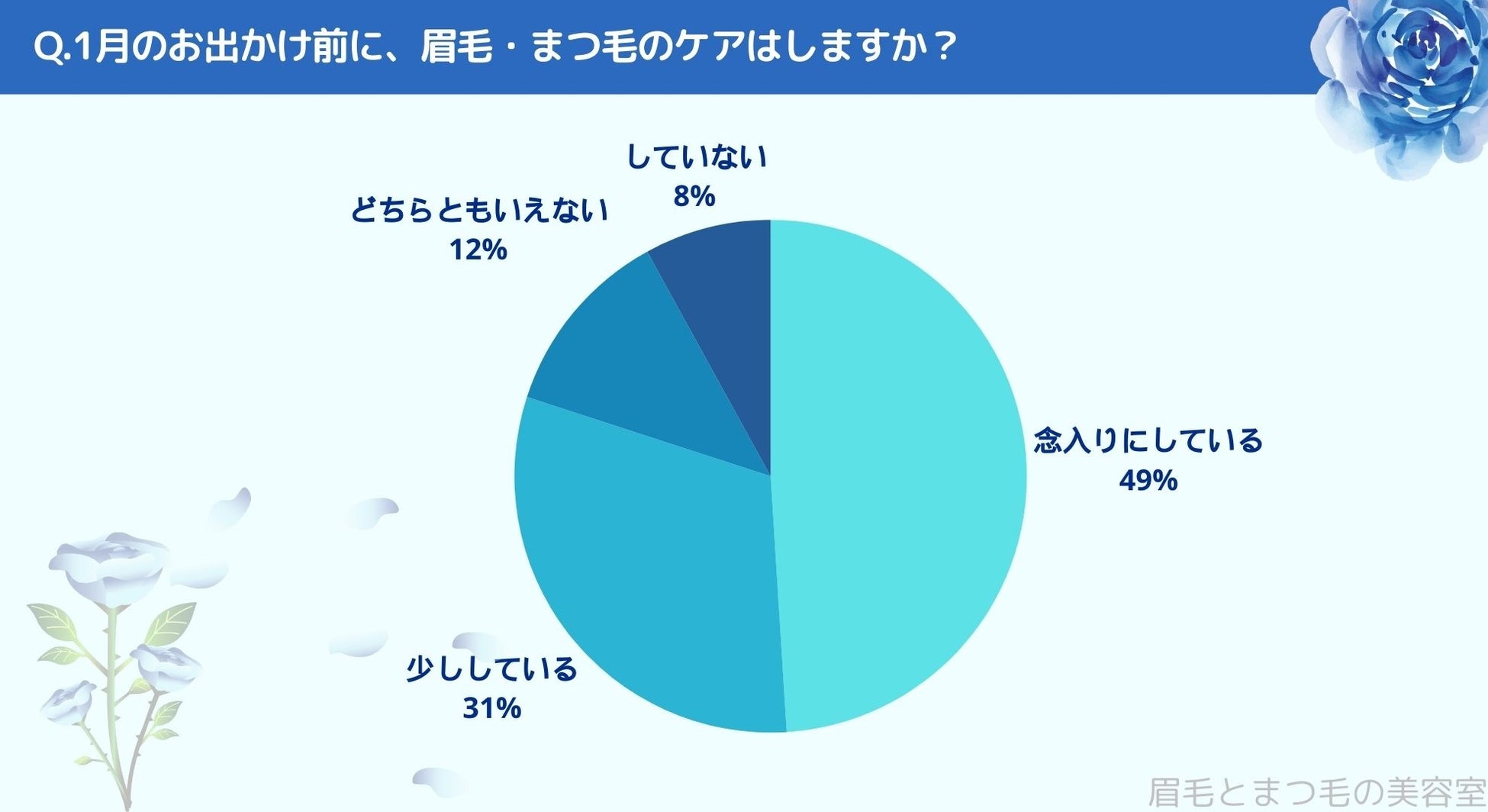1月のお出かけ前に、眉毛・まつ毛のケアをするかお聞きしたところ「念入りにしている(49%)」、「少ししている(31%)」、「どちらともいえない(12%)」、「していない(8%)」という結果になりました。