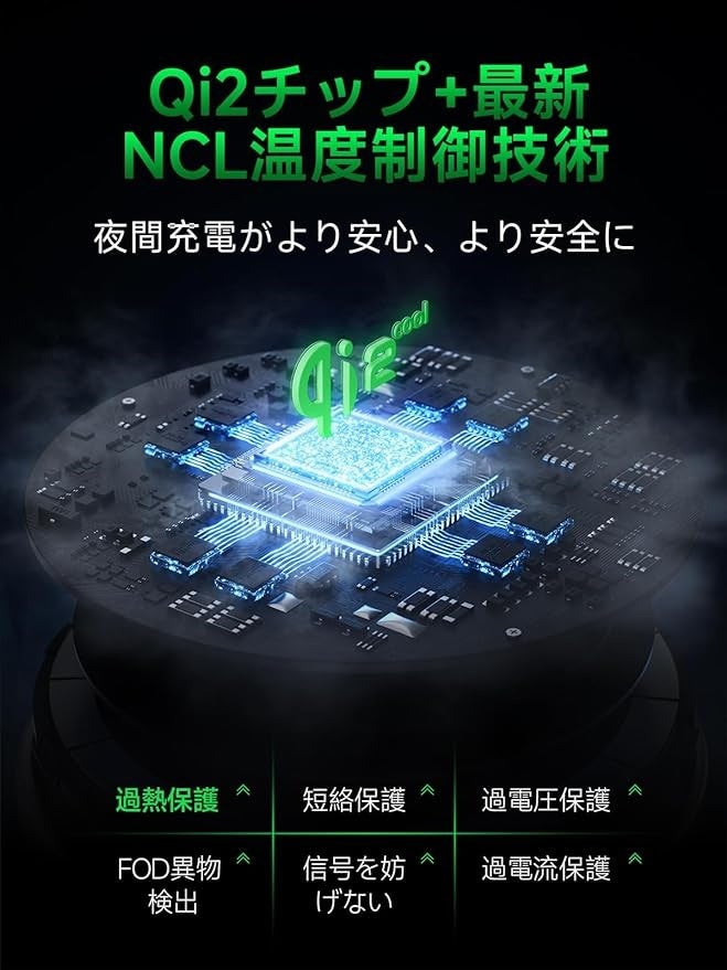 このmagsafe充電器は、当社独自開発の「NCL技術」(NICEGRET Cool Lシリーズ)を採用しており、毎秒20,000回以上の温度監視と24時間のスマート調整により、温度が常に安全な範囲内に保たれます。このマグセーフ充電器の高熱伝導性のアルミ合金素材と多層の放熱構造を内蔵し、効果的に放熱をサポートします。過熱保護、短絡保護、過電圧保護、過電流保護、信号干渉防止などの多重保護機能も備えています。全く新しい「異物検知」機能により、充電エリア内に金属異物を検知した場合、自動的に充電を停止し、過熱を防ぎます。電池残量が80%に達すると、自動的に充電モードが切り替わり、微小な電流でデバイスの電池の過剰消耗を防ぎます。卓越した低温安全充電性能で、毎晩安心してお休みいただけます!