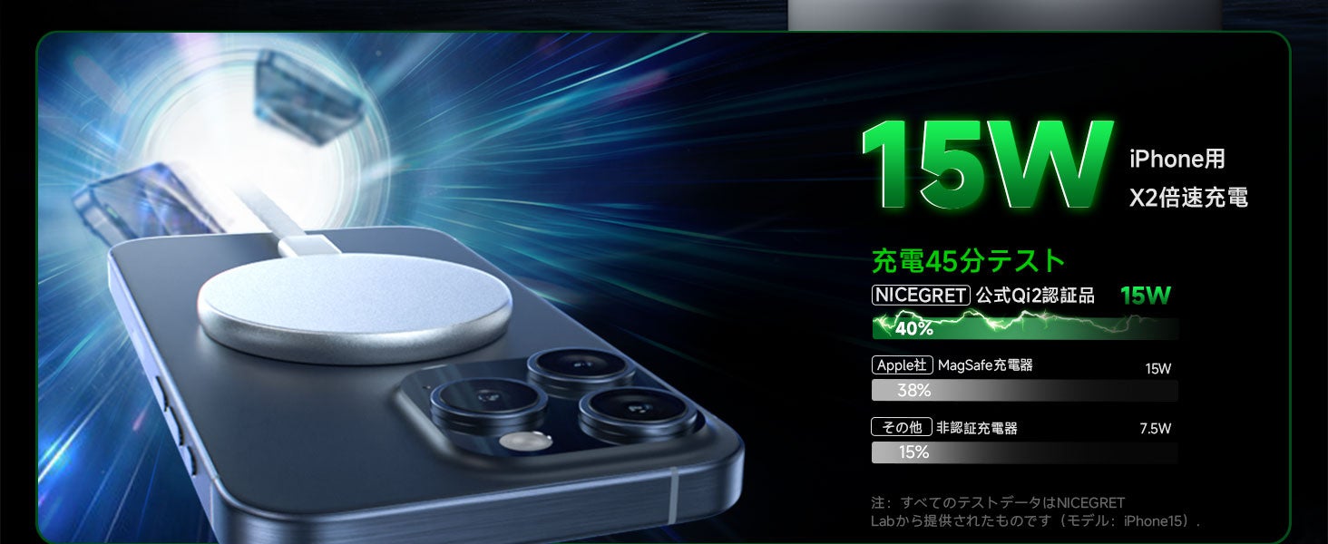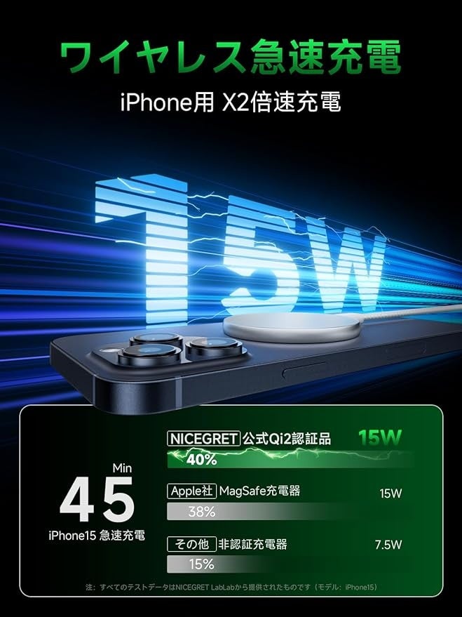 【Qi2 磁気充電器はiPhoneの充電速度 X2倍(15W)!】