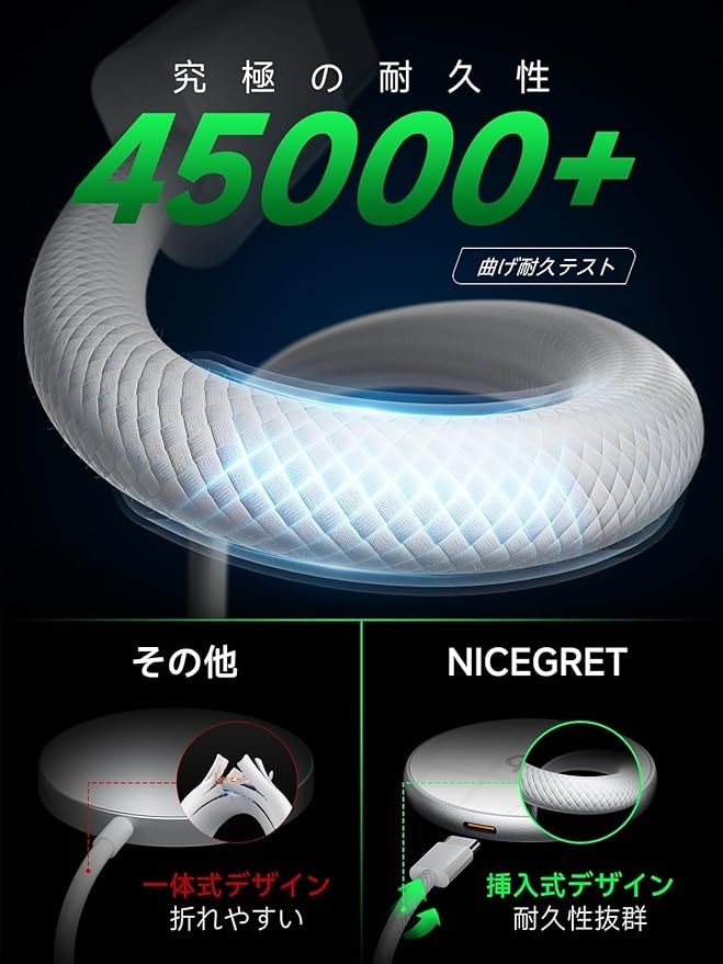 交互に織り込まれた「編み込みデータケーブル」を採用しており、45,000回以上の曲げ試験に合格しています。これは、TPEデータケーブルよりも引っ張り強度、耐摩耗性、耐久性。「 挿入式設計」データケーブルの摩耗や断裂を効果的に減らし、取り外しが簡単で、異なる長さやインターフェース、破損したデータケーブルの交換が便利です!