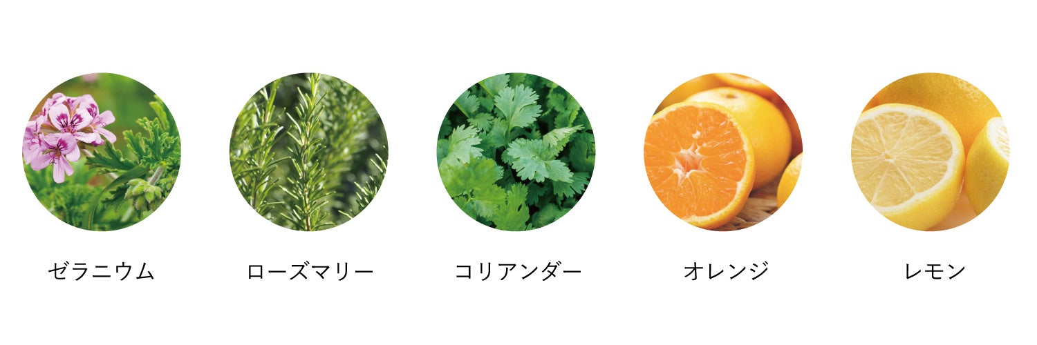 ゼラニウムの華やかで甘さのある香りにローズマリーの爽やかさとコリアンダーのスパイシーさをアクセントにプラス。オレンジとレモンで全体を明るく軽やかにまとめ上げたブルーミングハーブの香り。