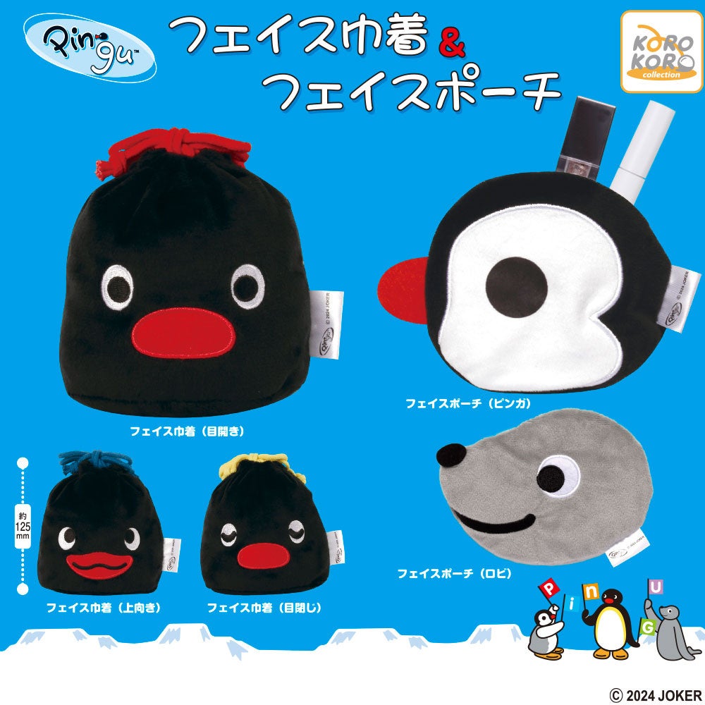 ラインナップは、ピングーの「フェイス巾着(目開き)」「フェイス巾着(目閉じ)」「フェイス巾着(上向き)」、妹のピンガの「フェイスポーチ(ピンガ)」、ピングーと仲良しなアザラシ・ロビの「フェイスポーチ(ロビ)」の全5種。