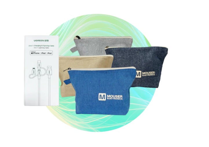 ノベルティ:マウザー特製ポーチ、ライトニング・タイプC・マイクロUSBの3in1充電ケーブル