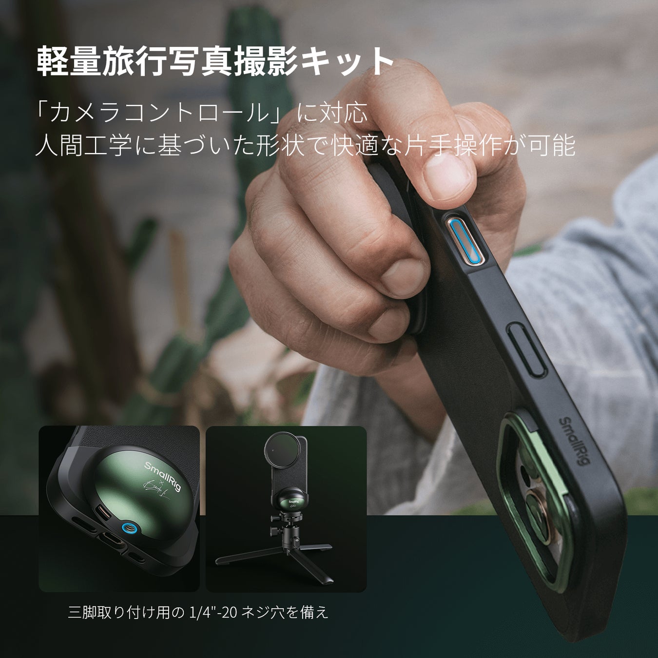 軽量旅行写真撮影キットは「カメラコントローラー」に対応し、人間工学に基づいた形状で快適な片手操作が可能になります。また、キャプチャーグリップには、サポートスタンドや三脚に簡単に取り付けられる 1/4” - 20 ねじ穴を備えています。