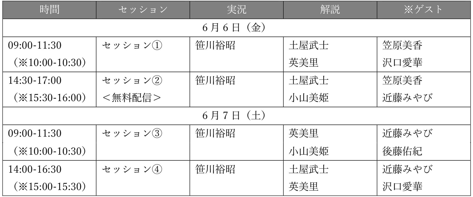 2⽇間合計10時間、4つのセッションに分けて⾏われる公式テストは、SFオフィシャルアナウンサーの笹川裕昭が実況を務め、解説にSF オフィシャルアドバイザーの⼟屋武⼠、ピットレポーターにSF オフィシャルピットレポーターの英美⾥というレースさながらの体制でLIVE 配信いたします!また、各セッション2.5時間の間には「SF アンバサダー⼥⼦トーク!」に出演するメンバーがゲスト出演いたします!是⾮、サーキットへお越しの⽅もSFgoを⽚⼿にご視聴ください!