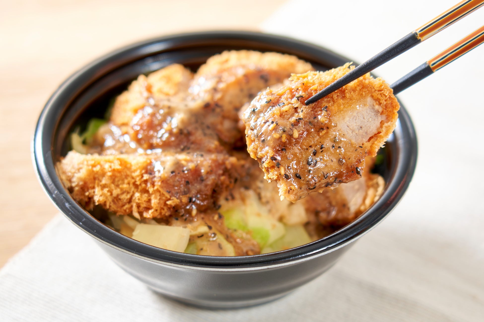 「ごまだれヒレかつ丼」は、この季節だけの限定商品です。まい泉自慢のやわらかなヒレかつに、3種類のごまをブレンドした濃厚な味わいのたれをかけました。かつの下にしいたボイルキャベツと甘酢生姜が箸休めとなり、最後まで美味しく召し上がれる丼ぶりです。