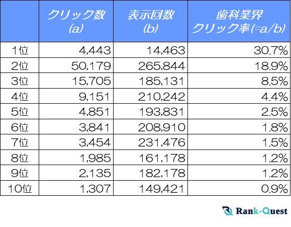 【SEO対策】で検索順位No.1を獲得した(注1)ランクエスト(https://rank-quest.jp/column/column/how-to-seo/ )は、2025年1月に歯科クライアントのサイトデータを基に、検索順位ごとのクリック率(CTR)を計測しました。