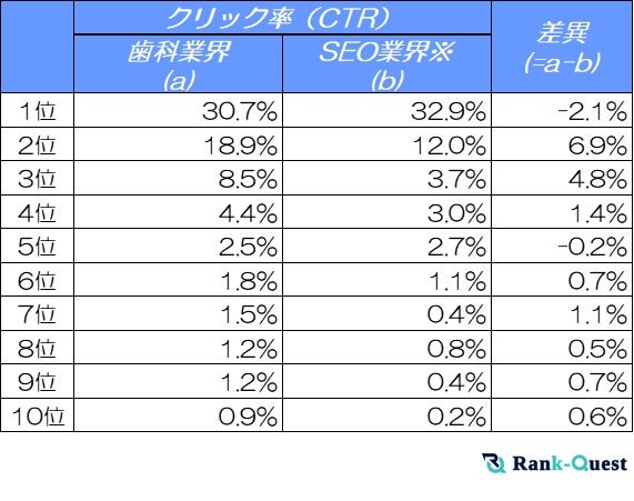 1位のCTRは歯科業界30.7%に対し、SEO業界32.9%と2.2ポイントほど高くなっています。トップ表示のクリック率においては、SEO関連キーワードのほうがやや優位な傾向が見られます。