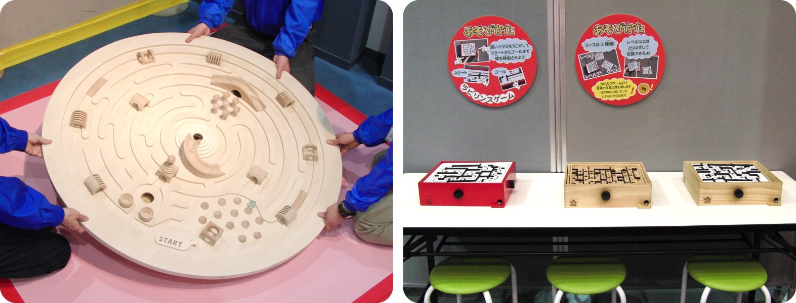 巨大なビー玉迷路や、木のおもちゃ、鉄球の入った立体迷路、ボール転がしゲームなど、様々なおもちゃも展示します。
