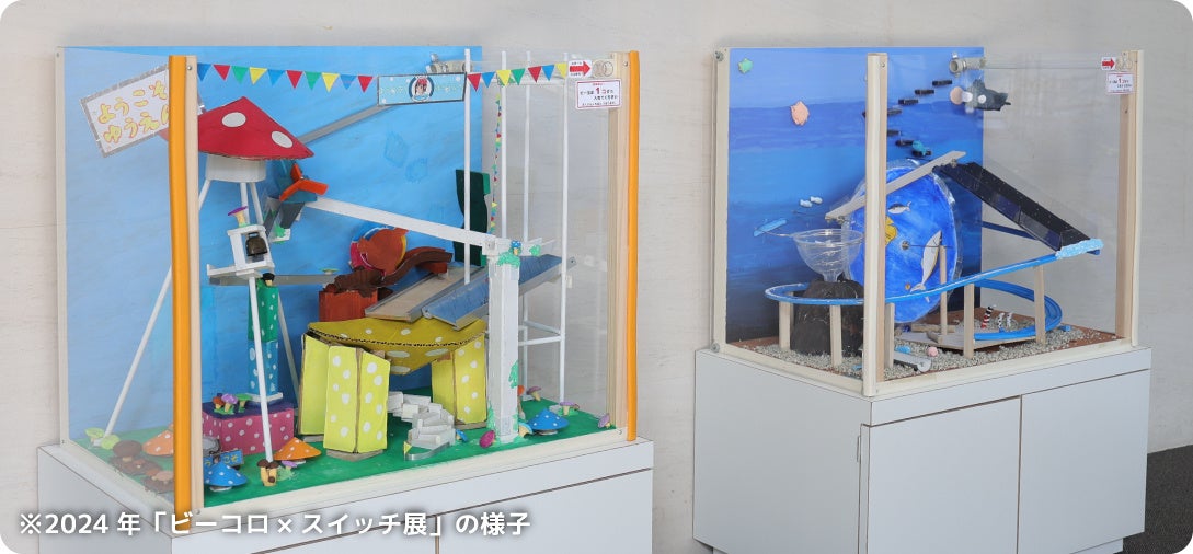 当館スタッフが身近な材料やテーマで作った、ビー玉コロコロ装置。これを「ビーコロ装置」と名付け新作約20台を展示しています。