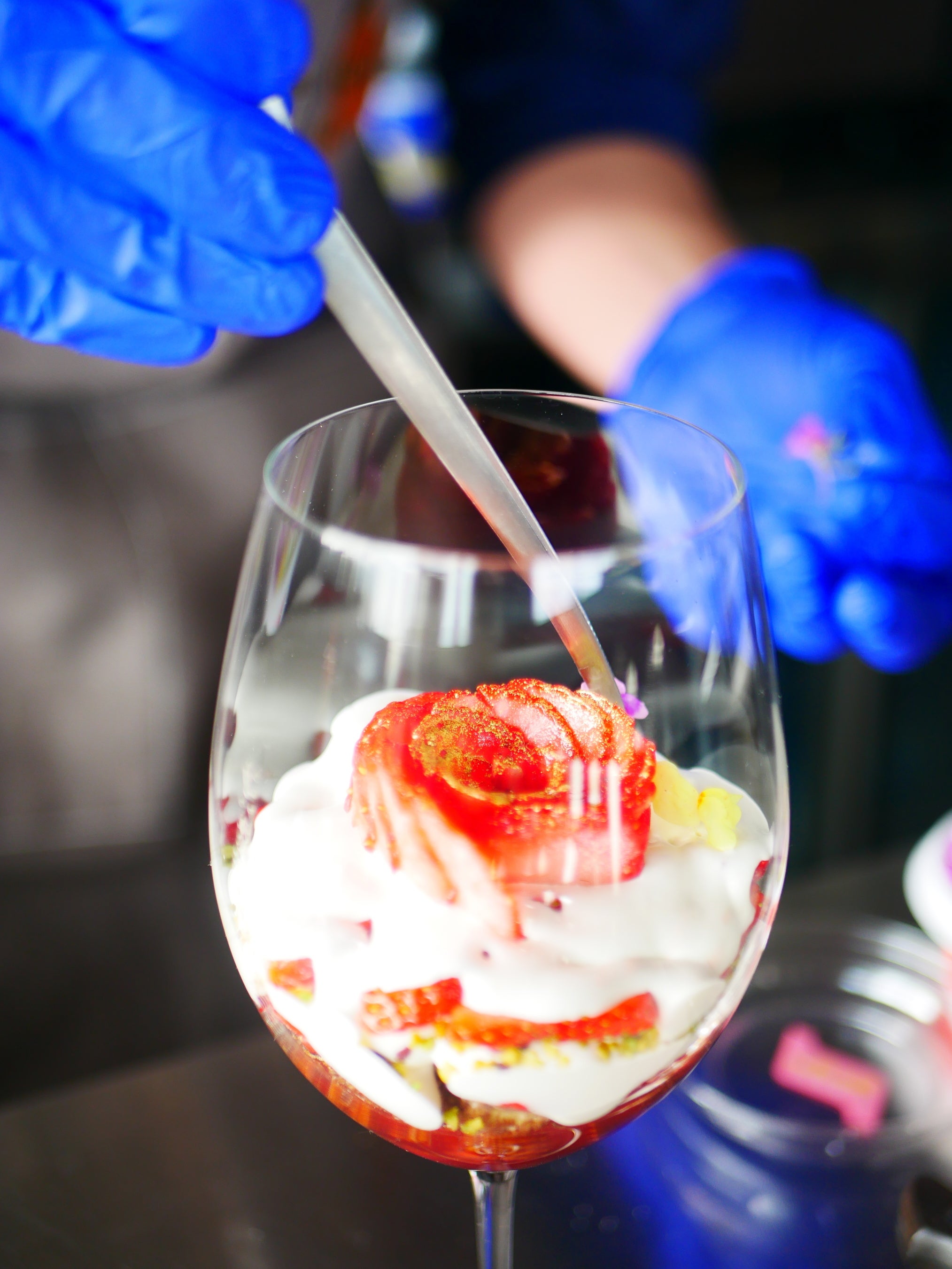 春の花畑をイメージしたフレッシュな苺を贅沢に使用した苺パフェ。ホイップされたチーズクリームと甘酸っぱい苺のマリアージュに、ピスタチオのアクセント。