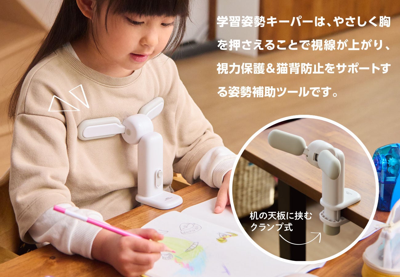 ブラケットに備えたクッションパーツが胸元をやさしく支えることで、猫背の姿勢を物理的に防止し、良い姿勢の維持をサポート。目が机に近すぎて視力をが低下することを防ぎ、良い姿勢を保つことで体への負担が軽減し、疲れにくくなるため、集中力の向上や学習パフォーマンスの改善も期待できます。