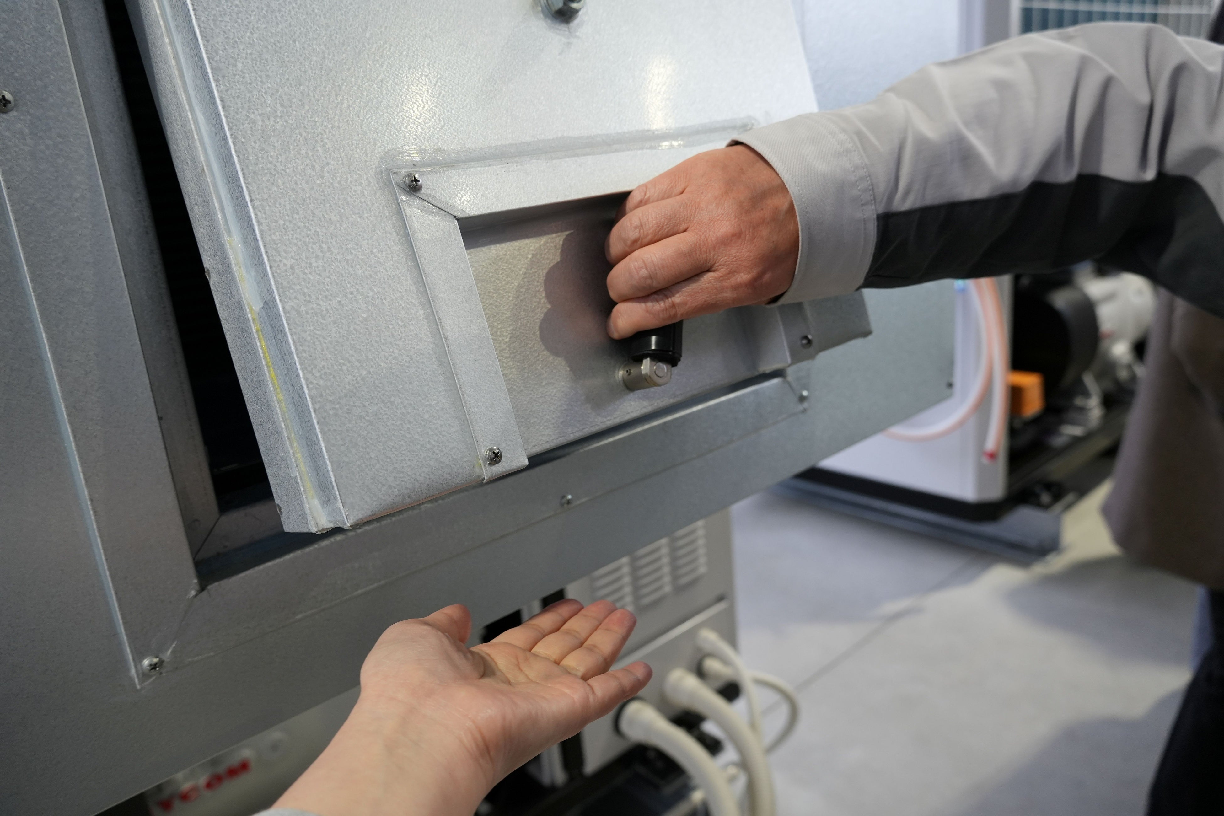 最大90℃の給湯、マイナス温度の冷水、そして最大120℃の熱風(エコシロッコ)を実際にその場でご確認いただけます。稼働時の音、風量、温度を肌で感じることで、導入後の運用イメージが具体化されます。