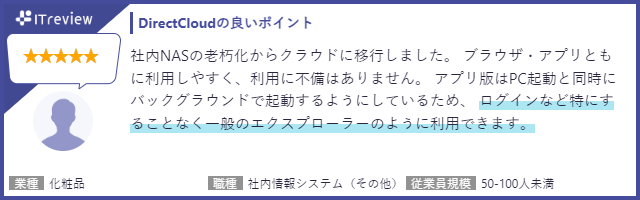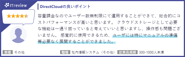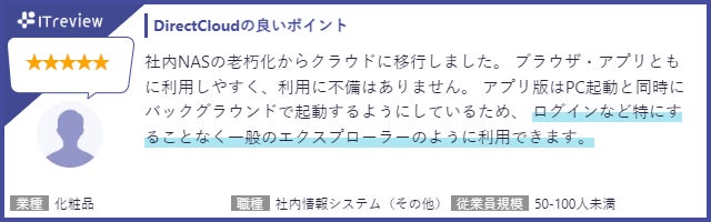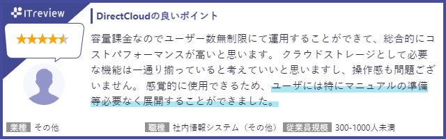 DirectCloudは、ご利用企業様から継続的にレビューを獲得しており、2024年1月時点でレビュー数162件、